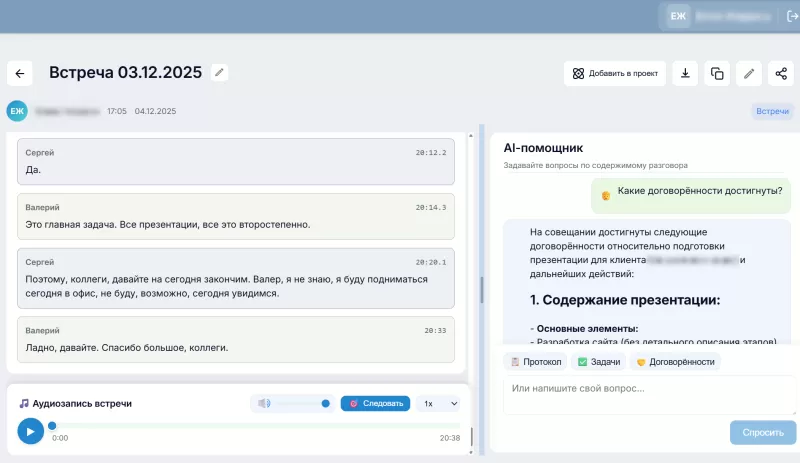 Для точного протокола важно распознавать участников, разделять реплики и фиксировать, кто что сказал. Это облегчит протоколирование совещания. - Автоматическое формирование протокола по шаблону.