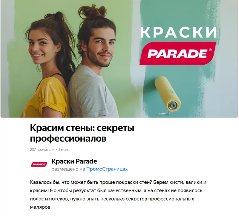 В рамках продвижения отечественного производителя красок Parade мы анализировали проблемы аудитории. Выбирая краски, покупатели сталкиваются с информационным перегрузом: сотни вариантов, но непонятно, чем они отличаются на практике. Мы создали статью на тему «Как выбрать краску для стен?» в формате ПромоСтраницы: она решает эту проблему через экспертное руководство. Вместо навязчивой рекламы бренд дает четкие критерии выбора, превращая читателя в осознанного покупателя.