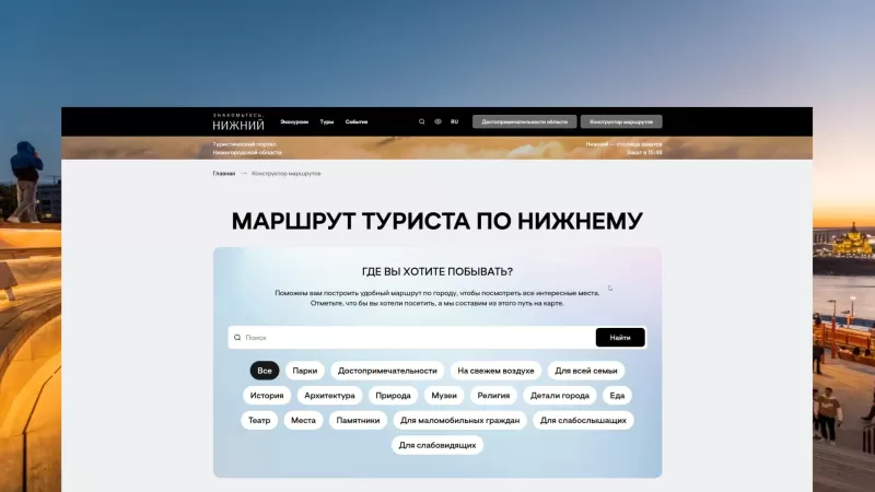 Портал помогает туристу планировать поездки по региону без лишних действий. Ключевая особенность и сложность — конструктор маршрутов, который автоматически формирует персональный маршрут по интересам пользователя. Маршрут можно экспортировать в Яндекс.Карты и Навигатор.