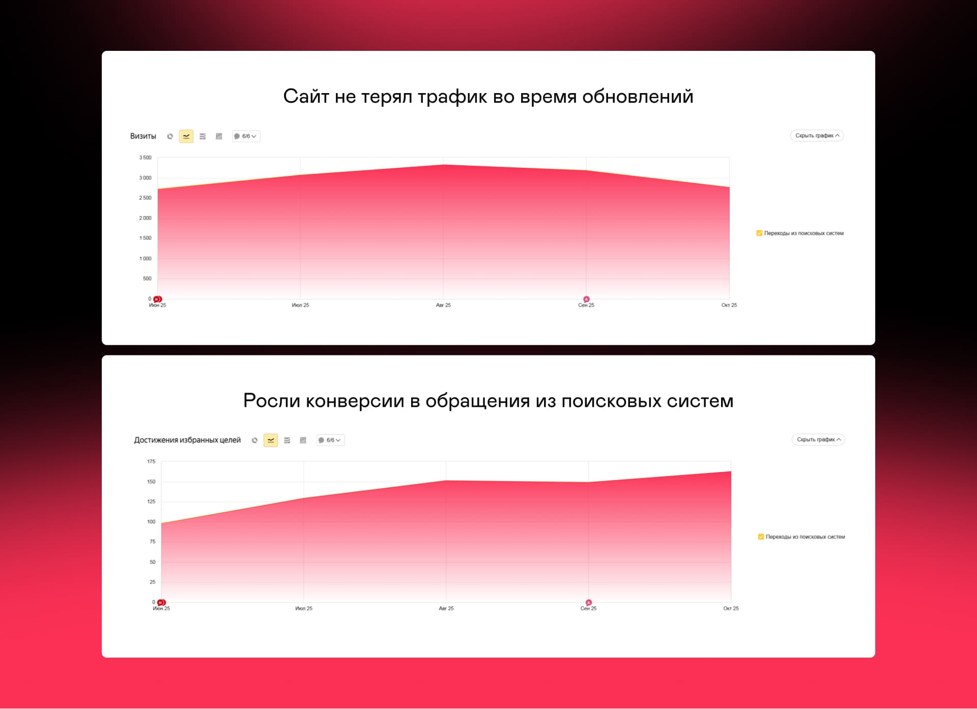 Мы отказались от серых методов продвижения, исправили критичные ошибки и выстроили SEO так, чтобы сайт рос стабильно и без рисков санкций.