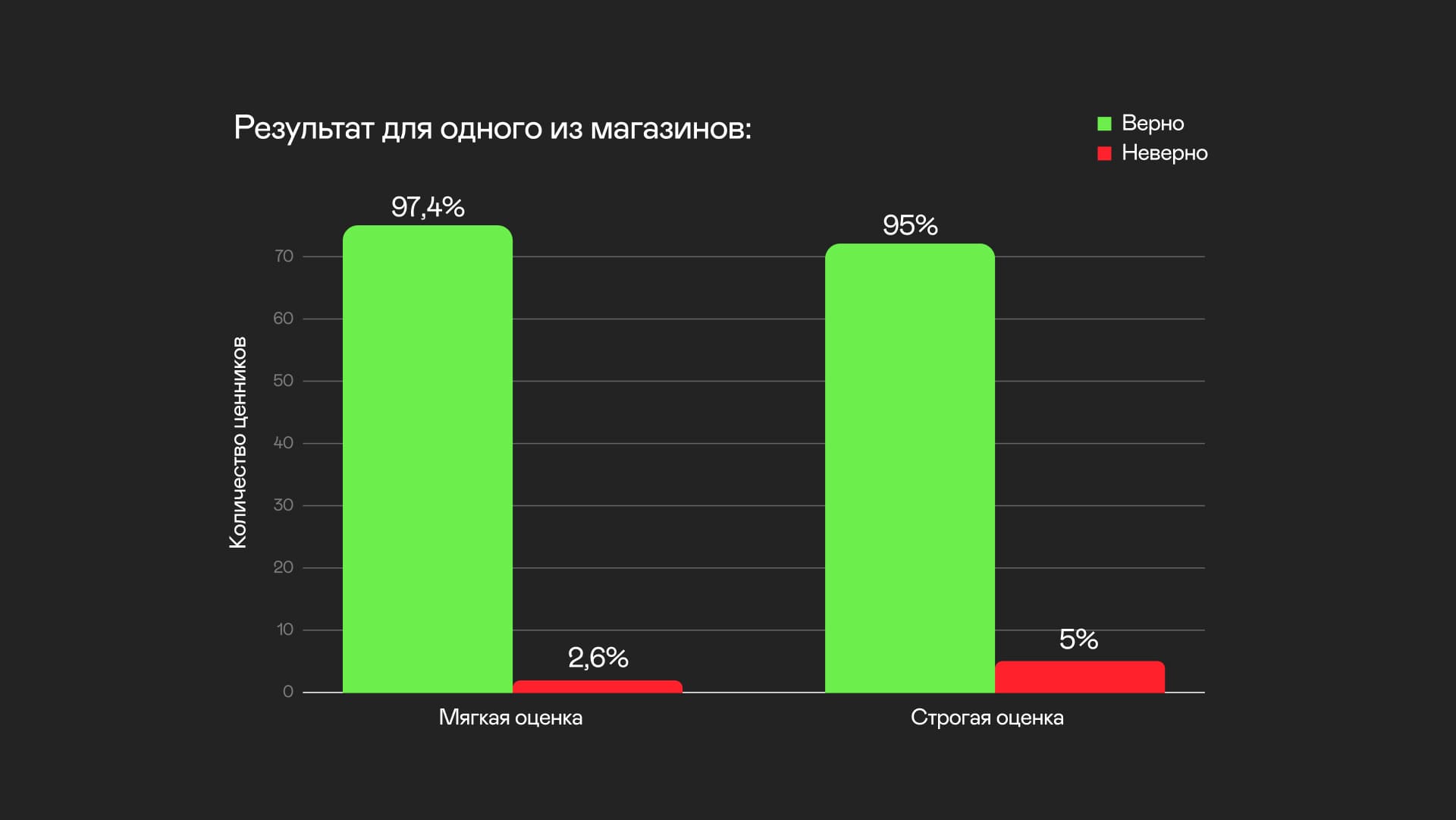 Первичное тестирование на 917 реальных фотографиях показало точность распознавания 93,5% — более чем в два раза выше, чем у предыдущей модели клиента. После доработок точность выросла до 95%.