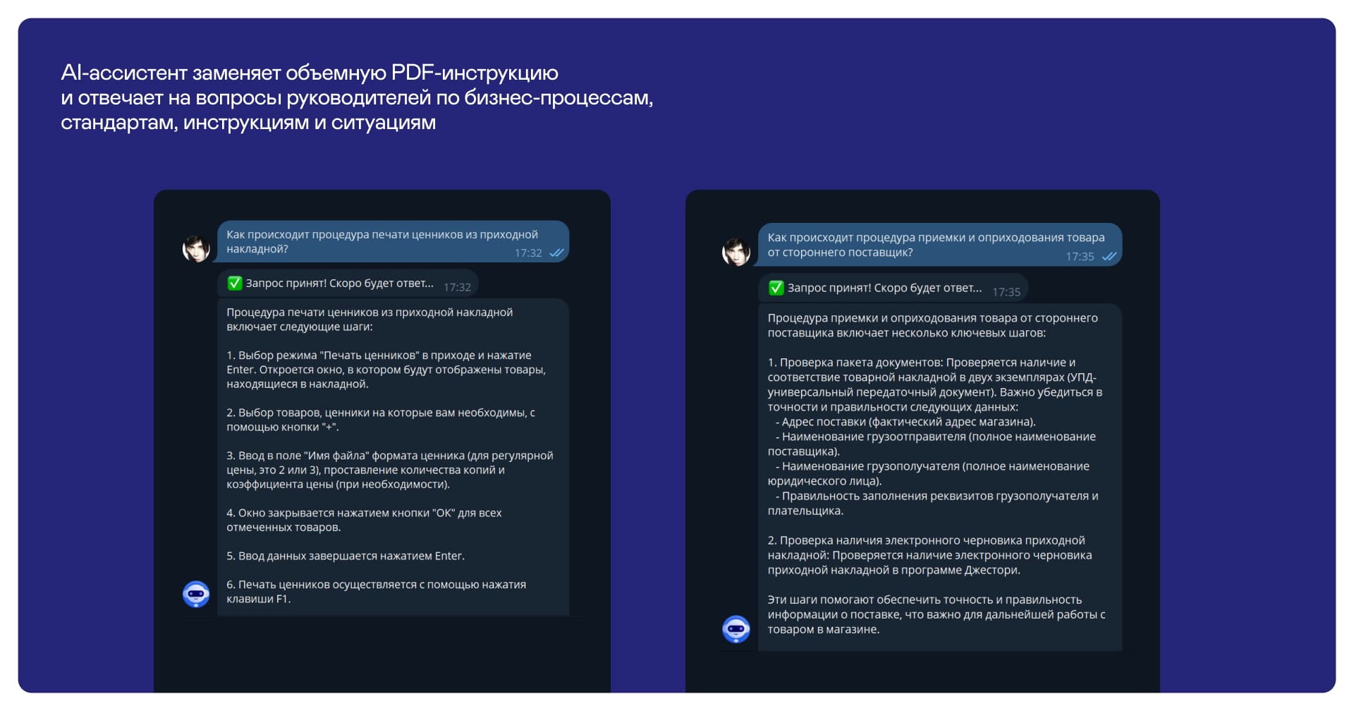 Сделали AI-помощника руководителя, который с помощью диалога в мессенджере заменяет работу с PDF-инструкциями и данными из внутренней базы компании.