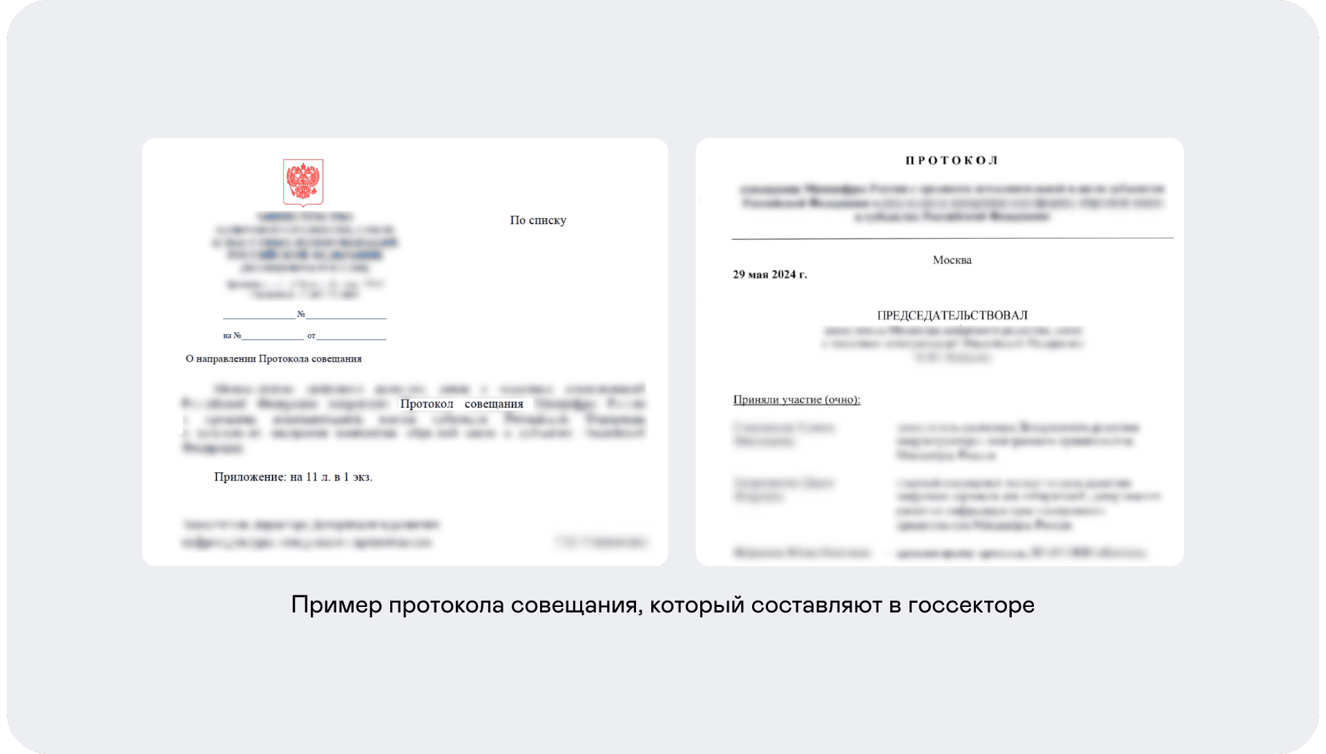 Готовые документы можно интегрировать во внутренние процессы для аналитики, отчетности и контроля задач. К примеру, добавить в базу данных компании и открыть для умного поисковика по внутренней базе знаний. Протокол можно сразу передать в отдел делопроизводства или загрузить в систему документооборота.