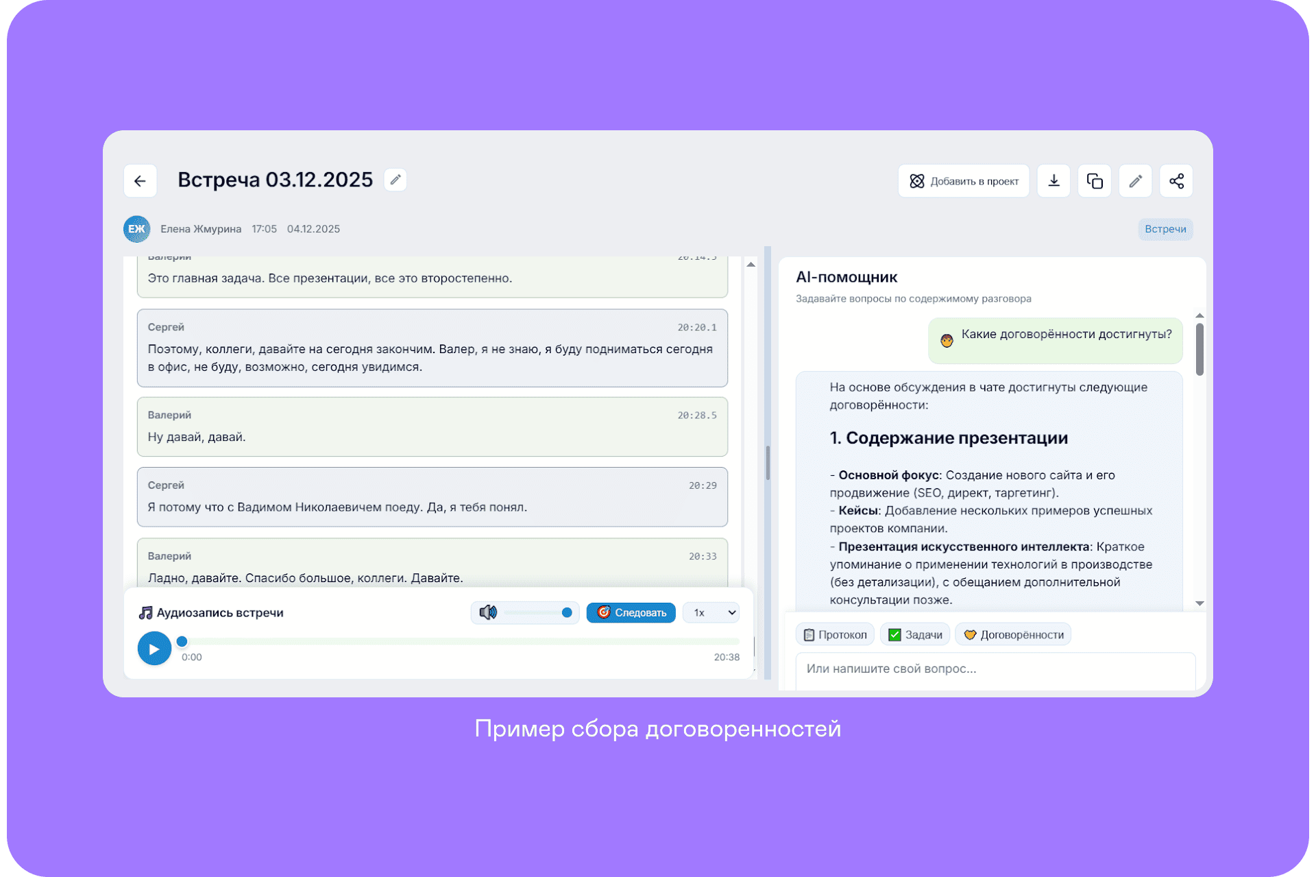 Встроенный AI-помощник сделает саммаризацию разговора: проанализирует ход обсуждения, вычленит договоренности, которых достигли участники совещания, и задачи, которые поставили — с ответственными лицами и дедлайнами.