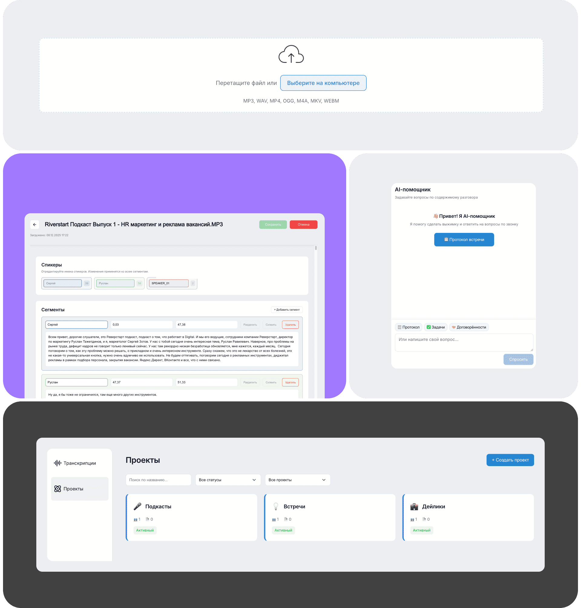 Сервис распознаёт речь и формирует читаемый текст с пунктуацией и абзацами — даже при разном качестве микрофонов, шуме, эхе, акцентах и похожих голосах спикеров.