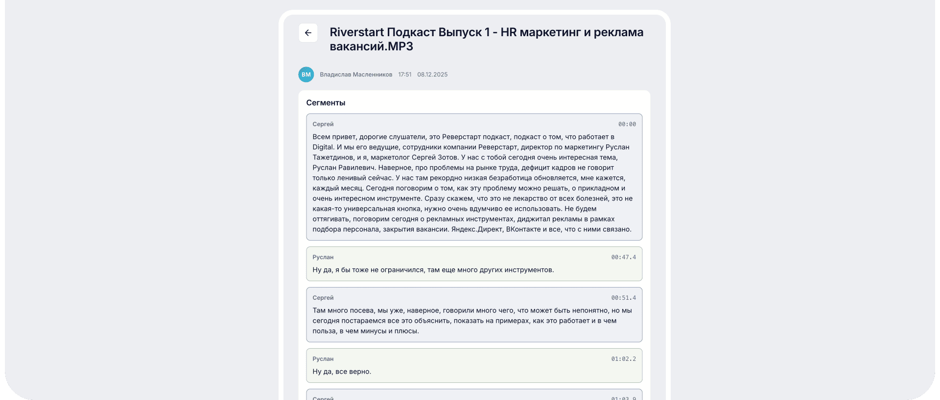 - Получаете транскрибацию: модель расшифровывает речь, выделяет участников и предоставляет таймкоды для проверки.