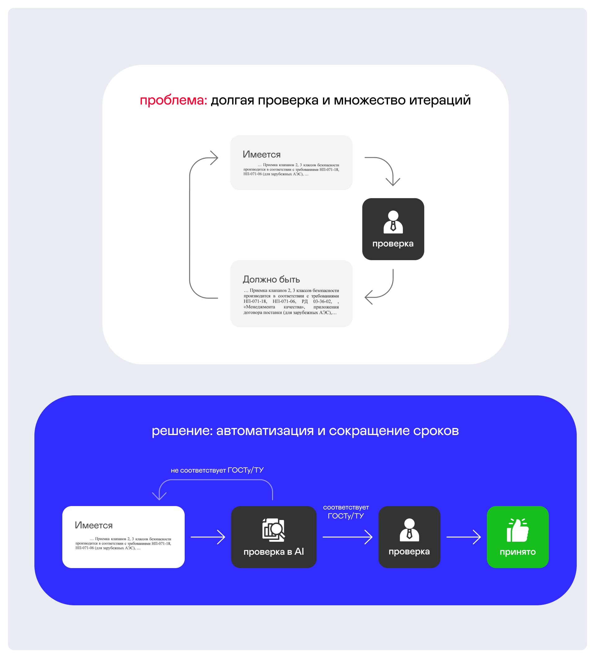 Задача — за счет внедрения AI для контроля документов сократить количество итераций согласований и ускорить проверку документации на соответствие ГОСТам и ТУ.