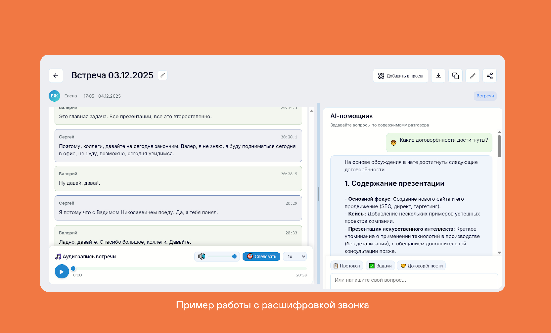 Если нужно узнать только итоги общения, а не весь разговор, можно использовать AI-ассистента. Он выделит ключевые договоренности, задачи, ответственных и сроки.