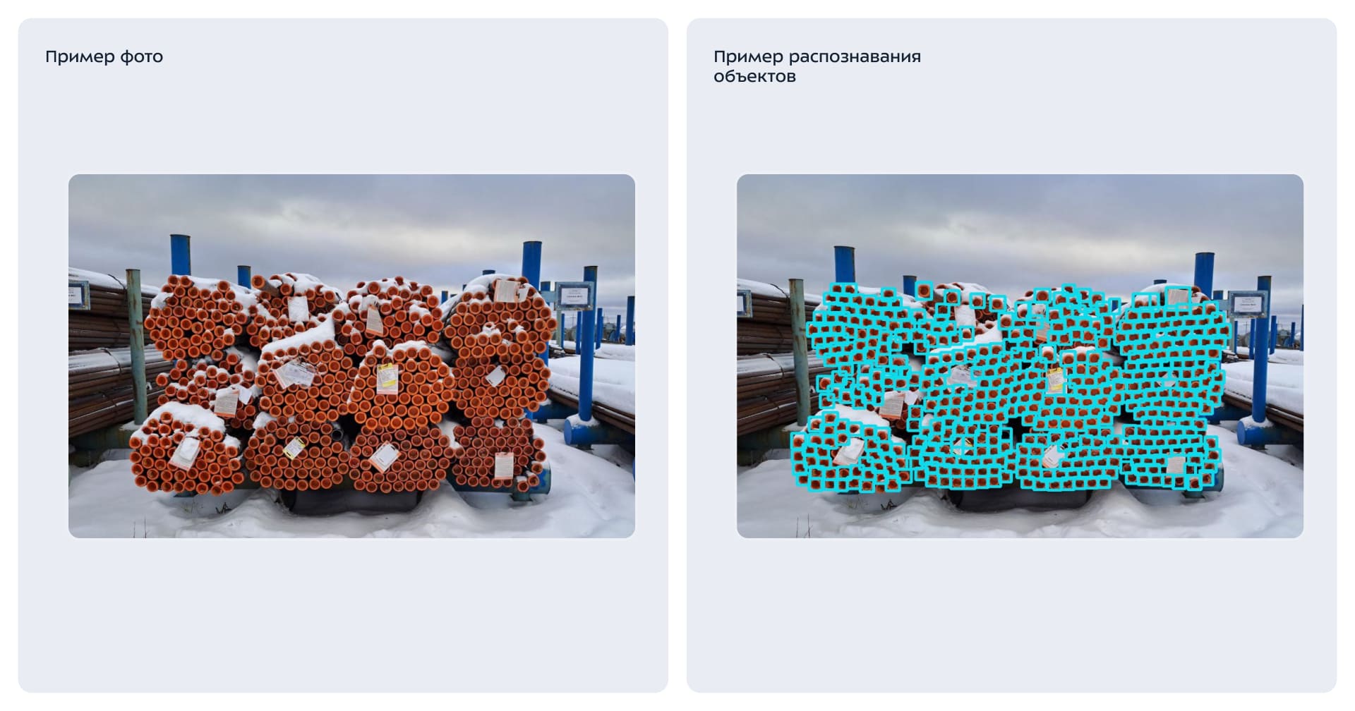 После обучения система стабильно распознает объекты и корректно считает их при съемке в цехах, на складах и при приемке материалов.