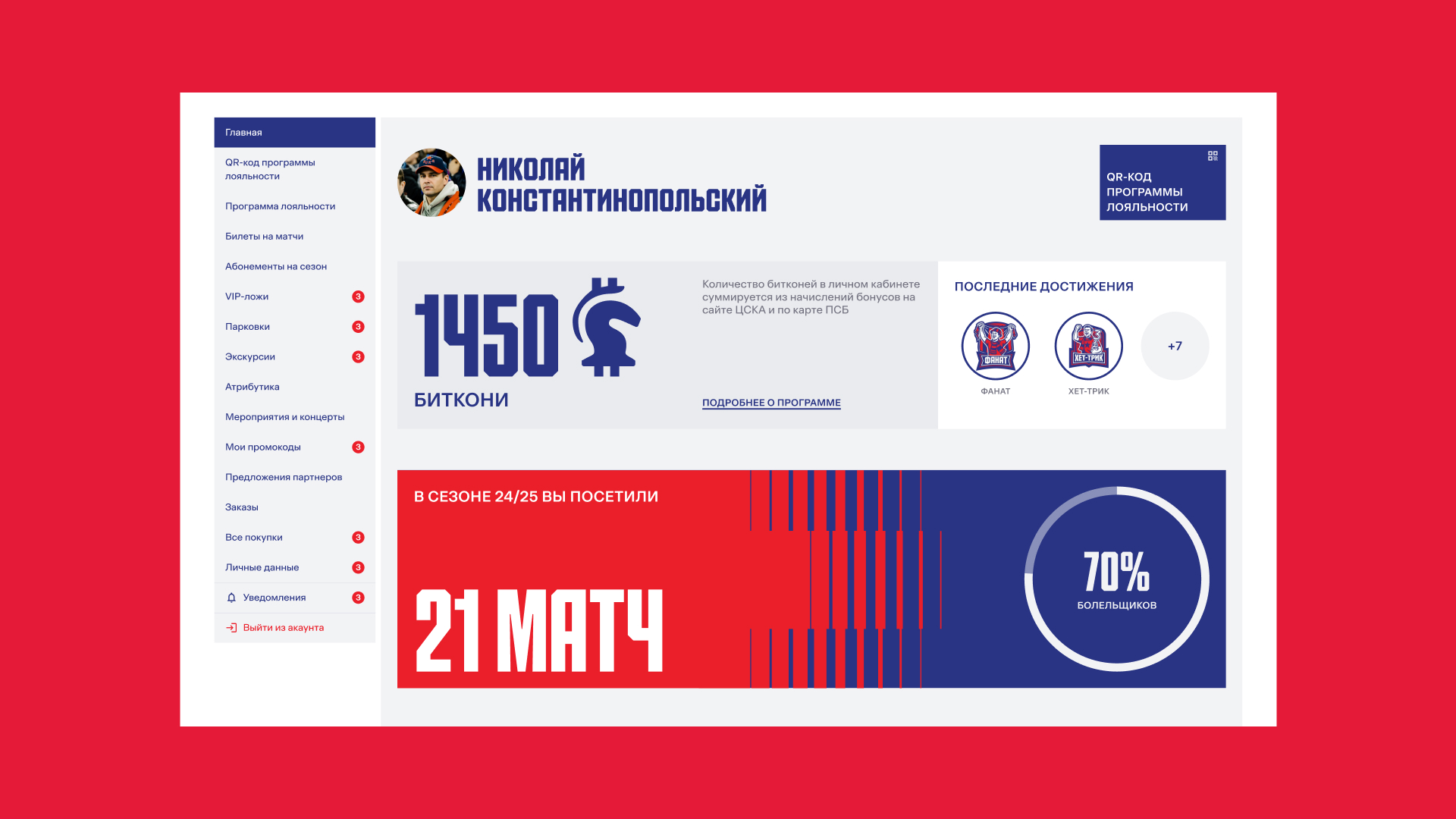 В личном кабинете отображаются покупки и заказы — билеты, абонементы, мерч и услуги, есть система достижений и можно отслеживать прогресс по целям. Для придания индивидуальности мы создали уникальные аватарки в стиле ЦСКА.