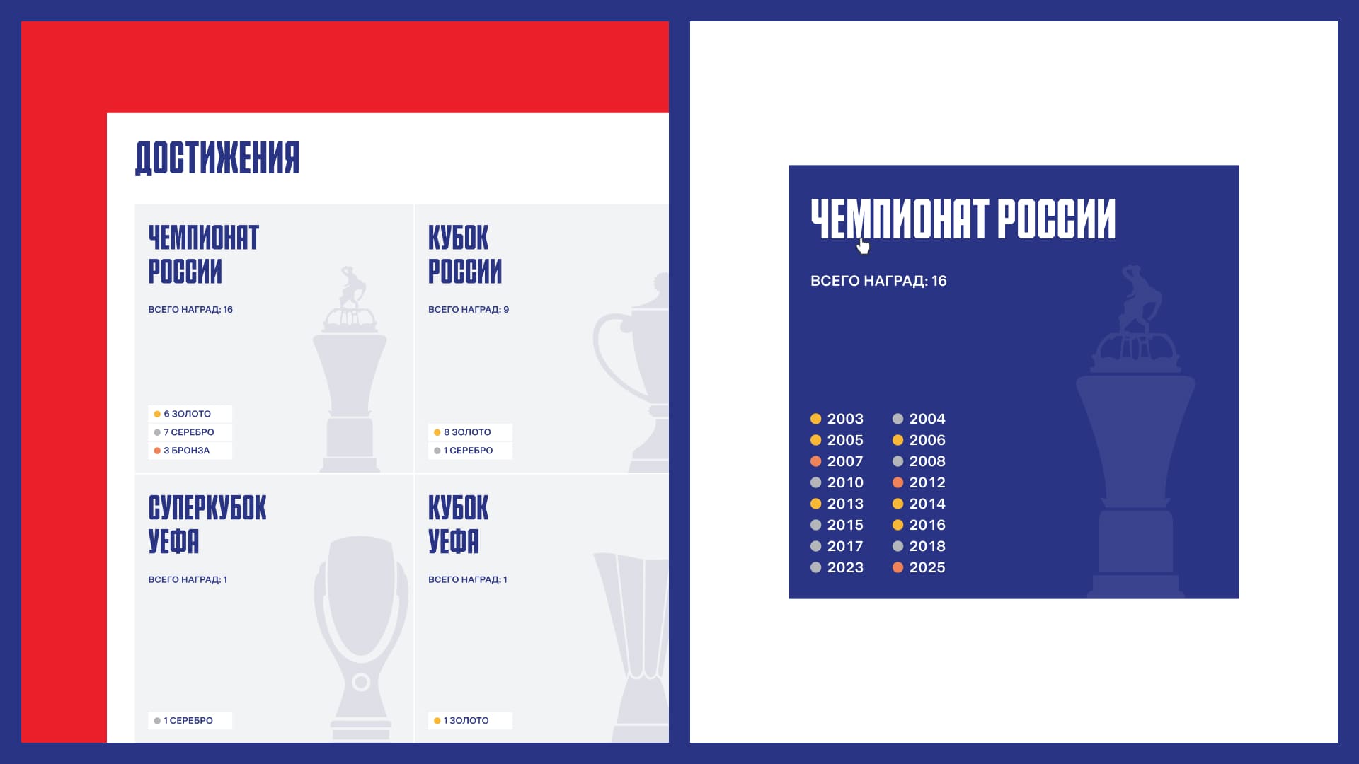 Мы сохранили статистику матчей, турниров и игроков с 1992 года и интегрировали систему RuStat, чтобы подтянуть статистику с 2022 и автоматически обновлять ее. На сайт подтягиваются результаты матчей, обновляются турнирные таблицы и пересчитываются индивидуальные показатели футболистов: сыгранные матчи, забитые голы, голевые передачи, карточки и многое другое.