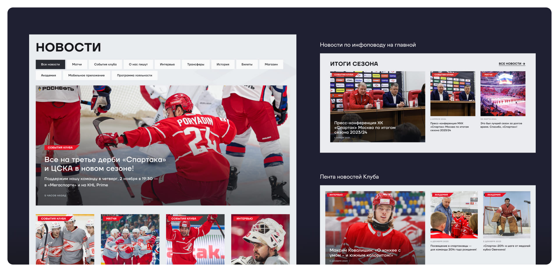 Мы сделали группировку новостей по инфоповодам на главной странице сайта хоккейной команды «Спартак». Материалы объединяются в блоки вокруг конкретных событий. Например, во время важного матча ХК «Спартак» пользователь сразу видит подборку всех новостей, касающихся игры — без отвлекающих от главного события постов. Такой формат помогает быстрее погрузиться в интересующий инфоповод и увеличивает глубину просмотра.