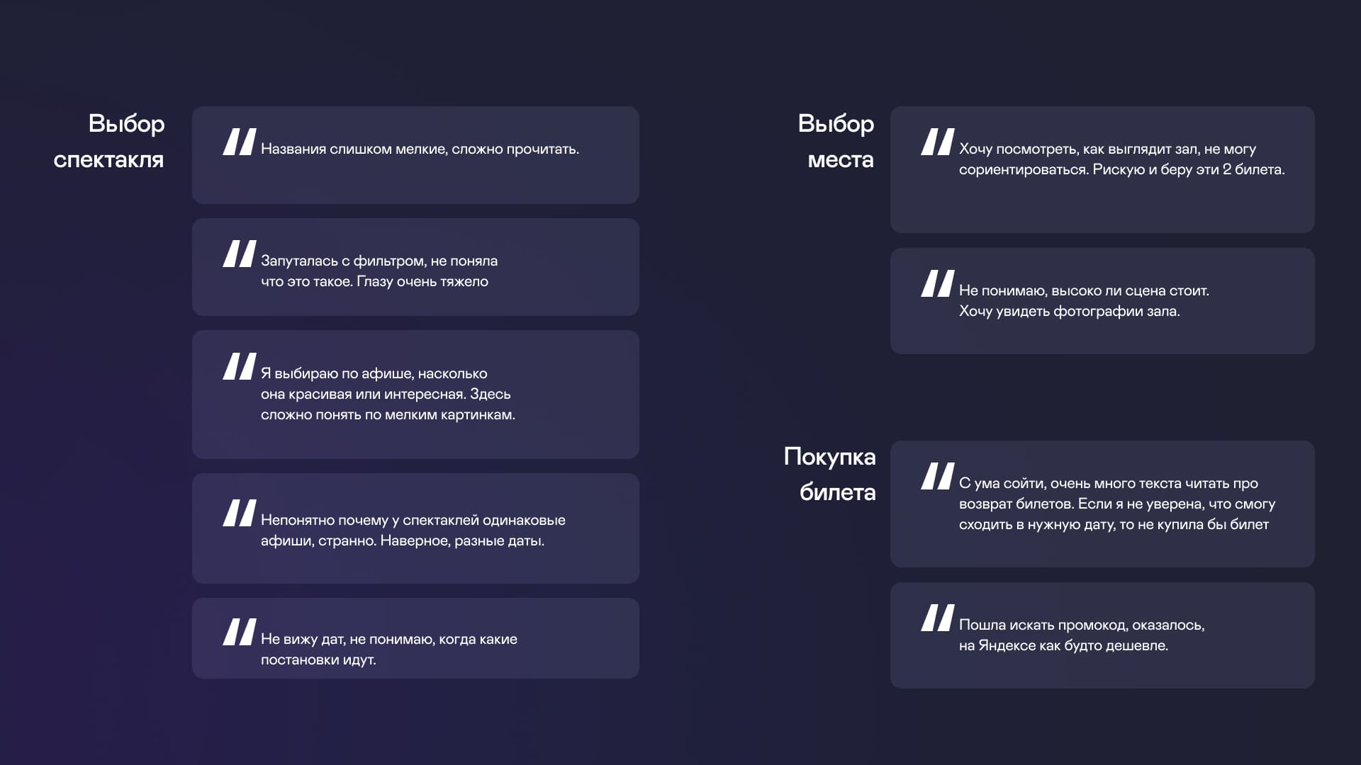 К примеру, мы проводили такое исследование для одного из театров: пользователи проходили путь от входа на сайт до покупки билета и комментировали свои действия.