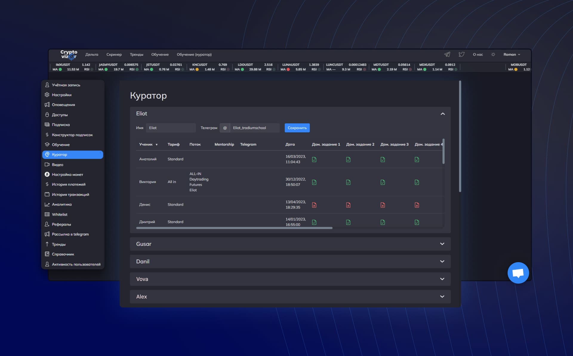 Куратор получает доступ к списку студентов, их прогрессу и активности: просмотренные лекции, выполненные задания, выбранный тариф. Это дает полную картину прохождения курса и позволяет быстро увидеть, где у ученика возникают сложности.