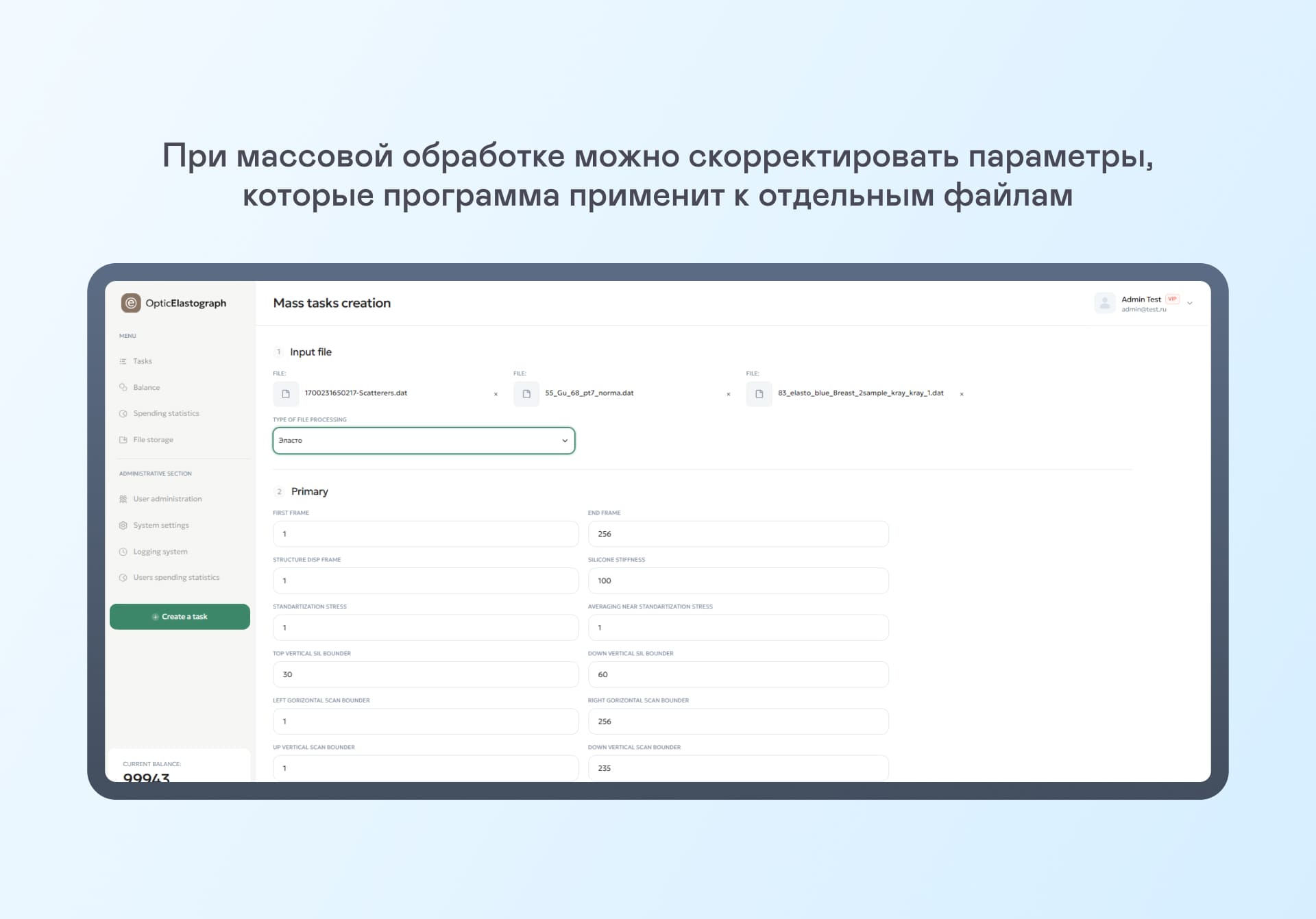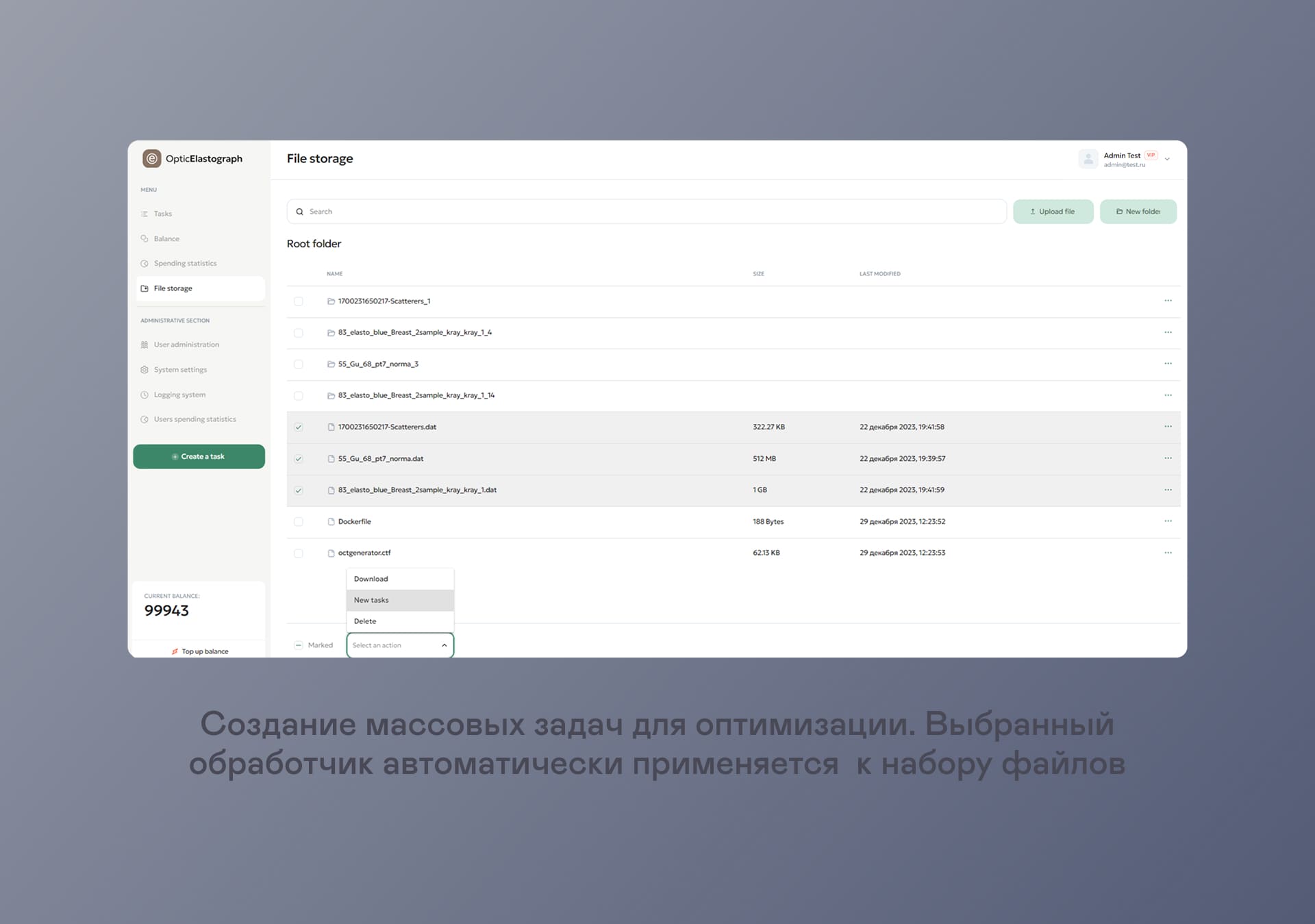 Мы реализовали механизм массового запуска задач: пользователь выбирает файлы из хранилища и отправляет их в обработку одним действием. Это упрощает работу с большими объемами и ускоряет получение результата