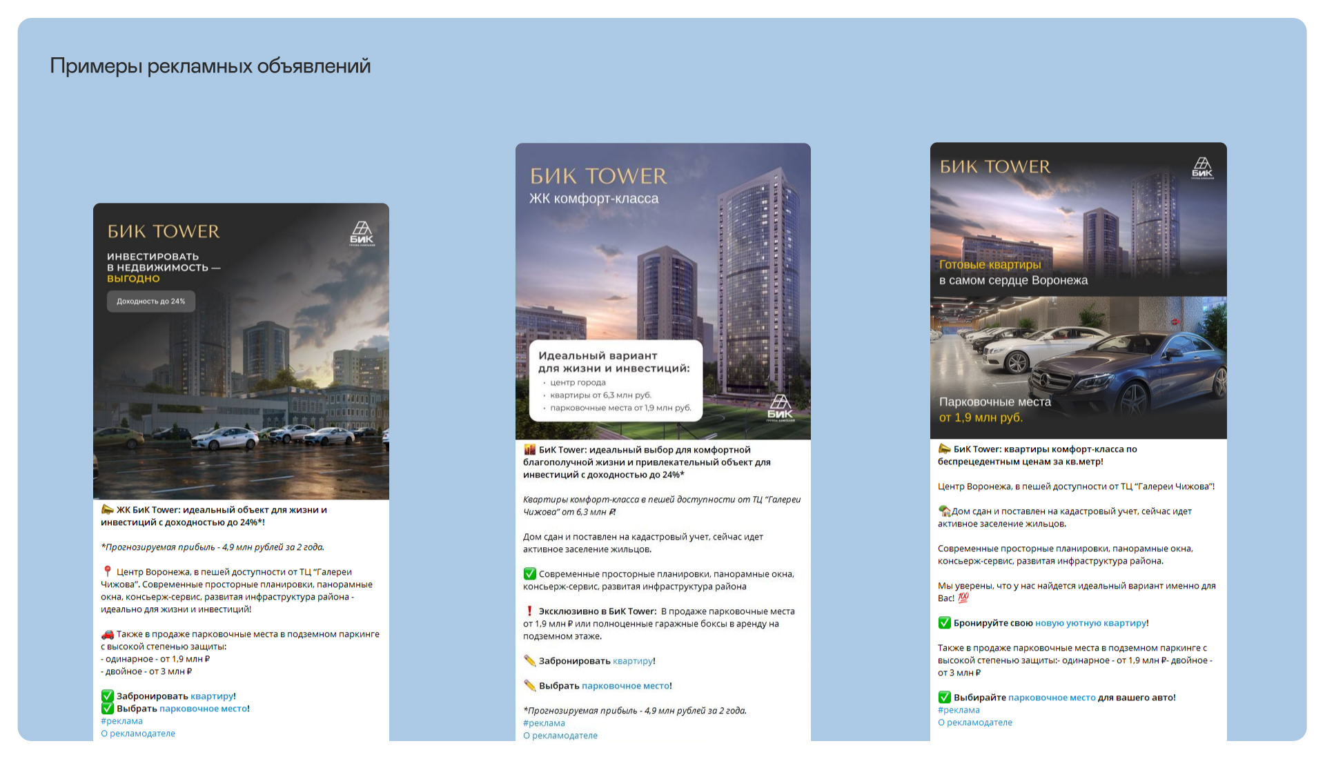 Мы провели рекламную кампанию для ЖК комфорт-класса «Бик Товер», используя регулярные посевы в Телеграм-каналах с потенциальной целевой аудиторией.