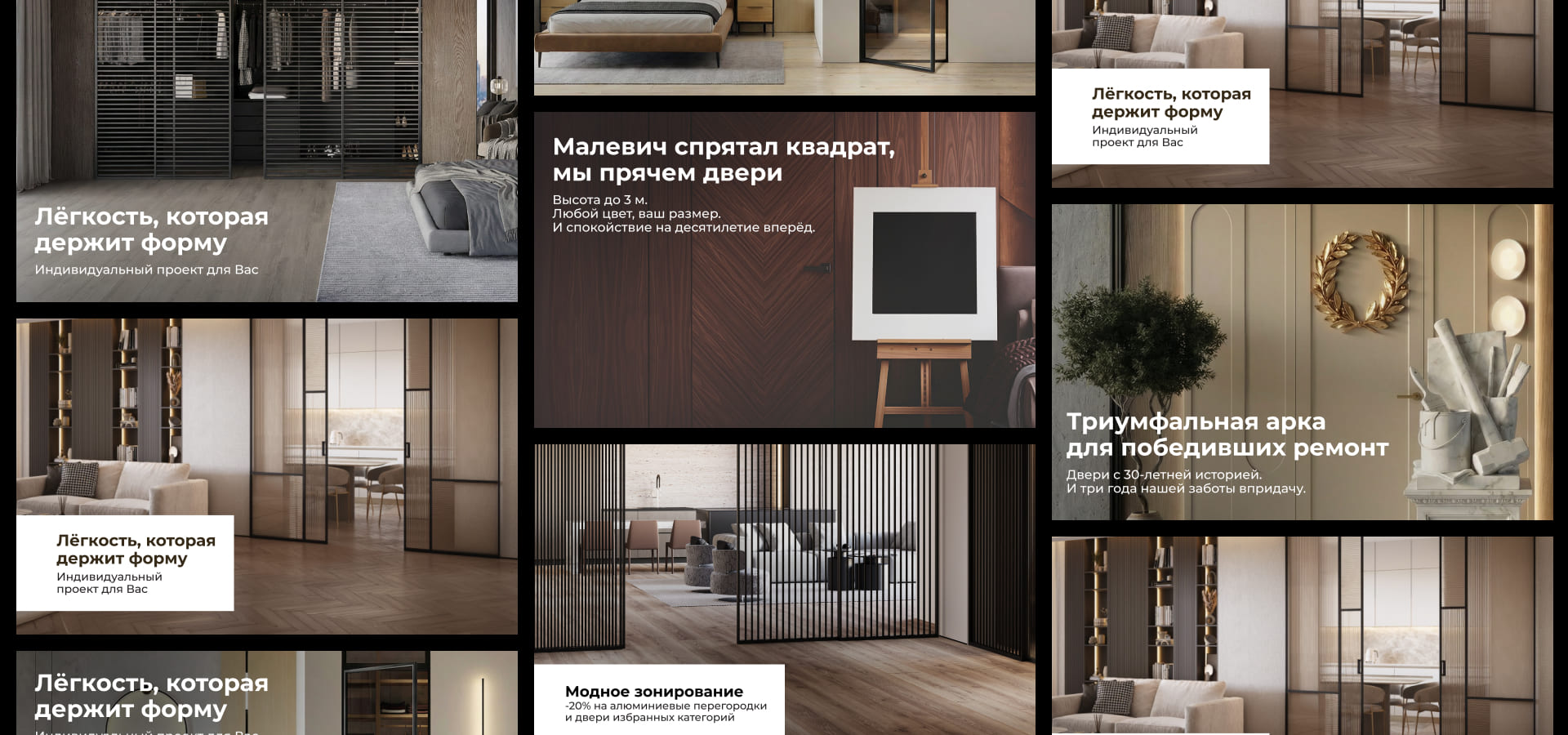 Проработали рекламные материалы: собрали семантику и подготовили тексты и креативы под разные категории дверей — от классических до дизайнерских решений.