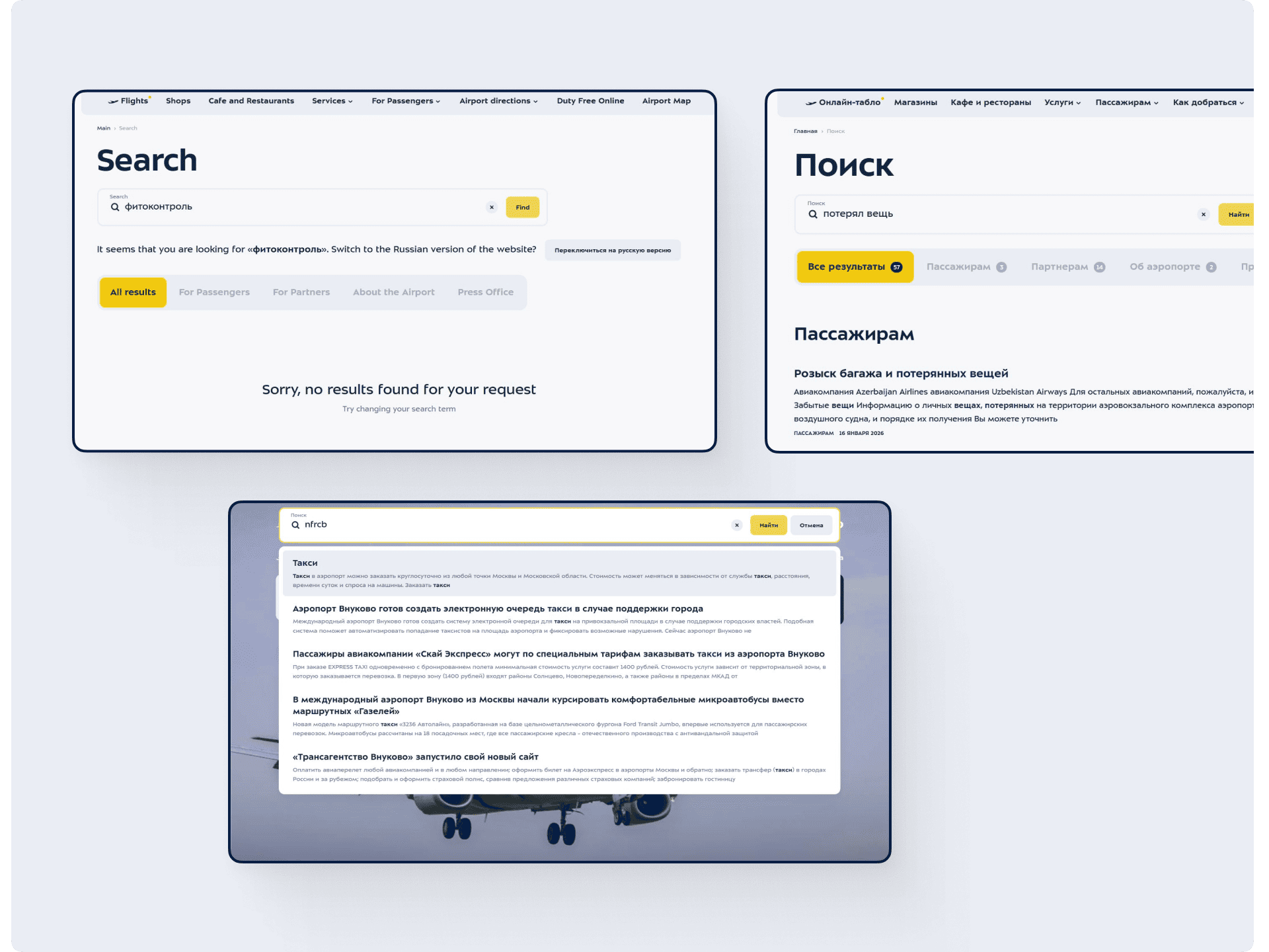 Мы решали эту задачу для сайта Международного аэропорта Внуково — объемного портала с большим количеством разделов для пассажиров, партнеров, с множеством сервисов и справочной информации. Работу осложняло то, что у сайта три языковые версии — на русском, английском и китайском языках.