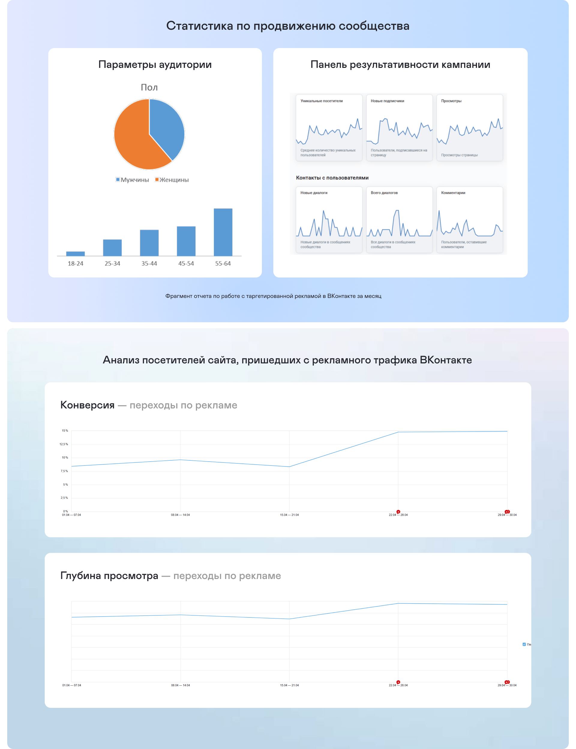 - общее количество показов рекламных объявлений и переходов на сайт и в группу в ВКонтакте;