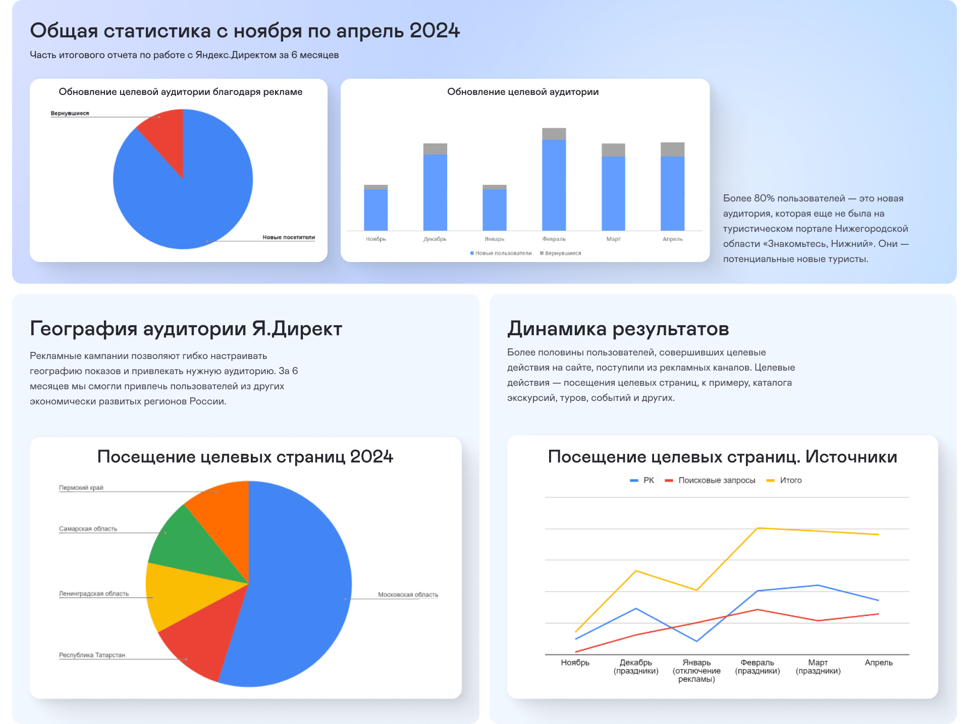 За полгода, которые шла рекламная кампания в Яндекс.Директе и таргетинг в ВКонтакте, мы привели на сайт качественную вовлеченную аудиторию — потенциальных туристов, которые заинтересовались посещением Нижегородского региона. При этом, благодаря настройкам кампании, клик стоил менее 20 рублей.