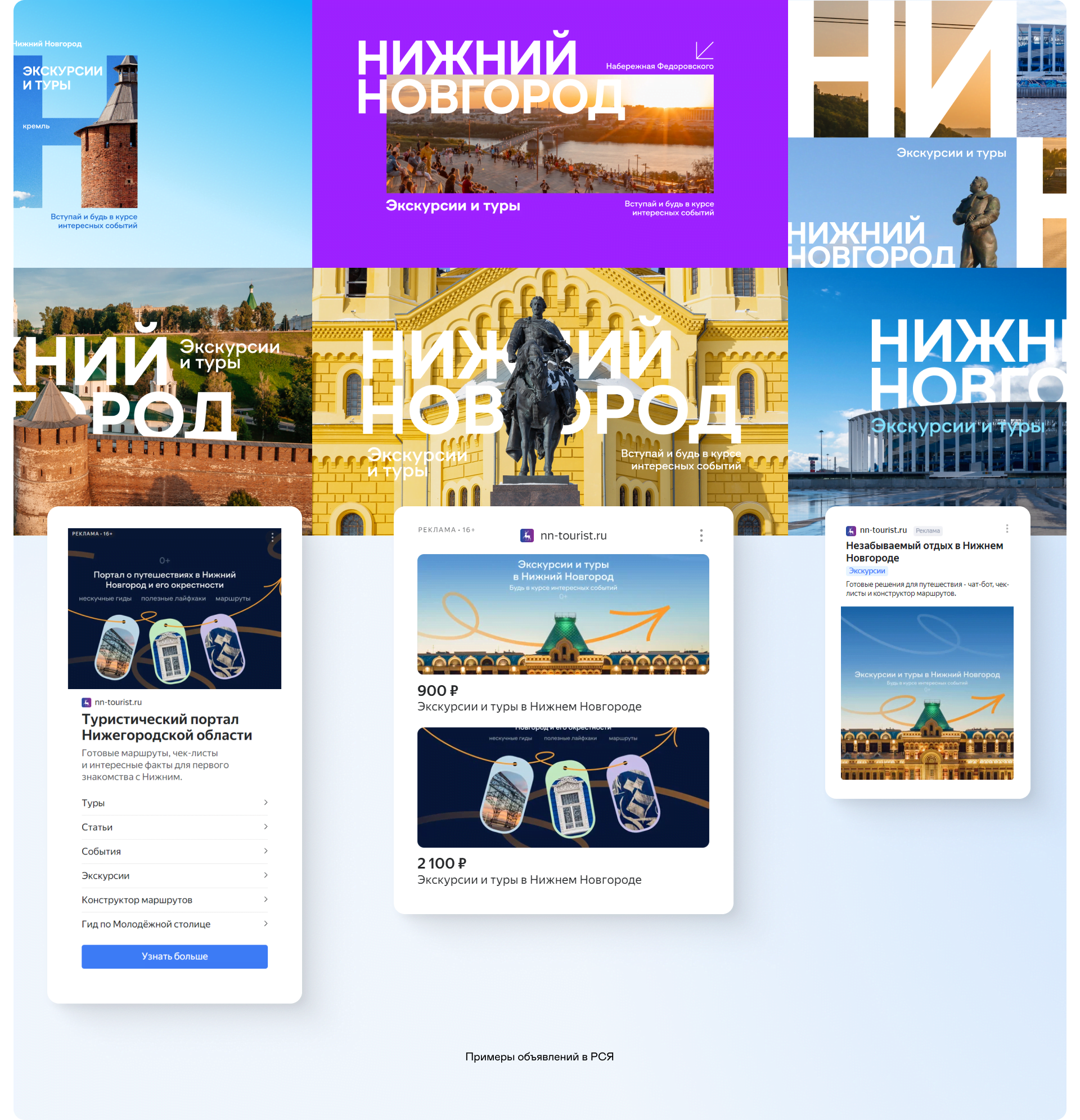 - Контекстная реклама по запросам, связанным с путешествиями по РФ и досугом в Нижнем Новгороде. Примеры: «достопримечательности нижний новгород», «музеи нижнего новгорода», «нижний новгород экскурсии», «отдых в нижегородской области», «путевки нижний новгород», «туры нижний новгород», «что посмотреть в нижнем новгороде» и так далее.