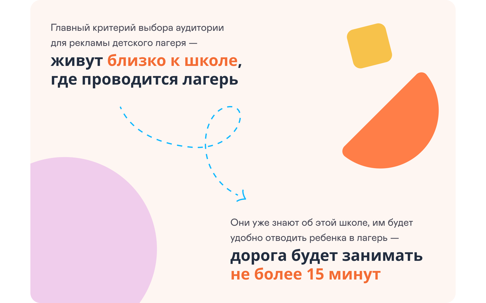 - геотаргетинг: ограничили территорию показов до радиуса в 3 км от детского лагеря;