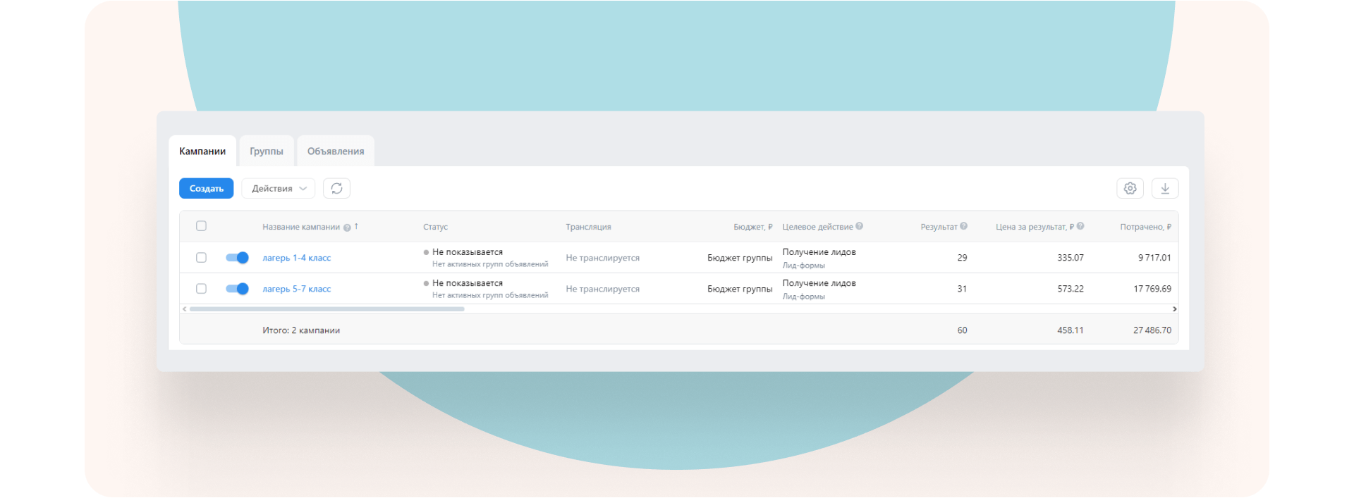 Ежедневный бюджет составлял 300 рублей на группу. Спустя неделю мы проанализировали первые результаты: родители активнее оставляли заявки на первую смену и менее активно на вторую — итоги рекламы первой смены были в 1,6 раз лучше.