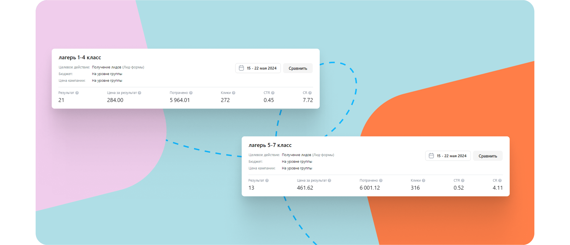 В мае 2024 года Riverstart провели рекламную кампанию для детского летнего лагеря, открытого на базе частной школы. Наша задача — сбор заявок на участие детей в двух сменах: